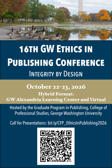 Alumni and current students in the GW Publishing program are invited to present their Ethics in Publishing Capstone projects or other research. Students and alumni of other graduate and undergraduate publishing programs are likewise invited to submit a proposal to share their research. We welcome proposals from professionals, researchers, scholars, and enthusiasts of publishing, library and information science, scholarly communication, media studies, and all fields with an interest in ethics in publishing.