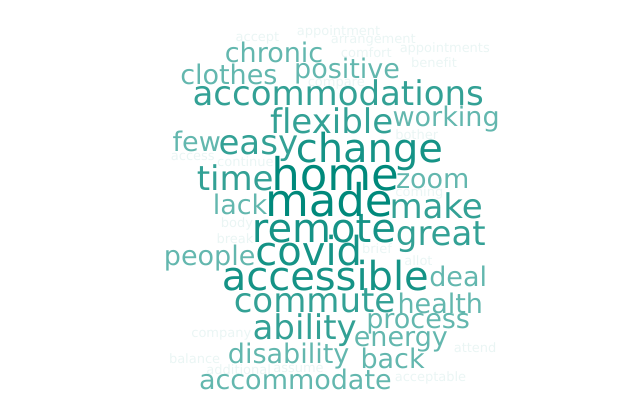 As previously discussed, there is a large amount of qualitative data on people with disabilities’ experience in the conventional in-person workplace, both within the publishing sector and US workspace generally speaking. I also prioritized gathering quantitative research that took the workspace impacts of COVID-19 into consideration. I was able to get a mixture of both qualitative and quantitative questions on the survey in order to get a good spread of information on this subject. Cat Mitchell’s UK study was used as a model for this survey (Mitchell 2021). When I reached out to Cat Mitchell, she no longer had a copy of the questions she had asked the participants, but she assisted me in refining the ones I came up with. This survey differs in scope as the applicants are in the US, and this study has the additional lens of looking at COVID-19, as well as other intersectional demographics like race, age, and gender.[20] I purposefully did not put a firm definition on a “publishing professional” or “publishing industry” since there are so many different jobs within these sectors, from warehouse, printing, editing, marketing, and business, to different types of publishing such as commercial, academic, and more. I wanted to hear from as wide of a group of people as possible for this study. For future studies, it may be helpful to have examples of different publishing-centered jobs/companies, as well as a clear statement that those with disabled children could also apply since they can face similar discrimination due to their child's disability status. I think it would also be worthwhile to have an avenue to gather information from non-disabled allies who have also witnessed these types of discrimination as several non-disabled people contacted me throughout this study expressing the desire to contribute to this overall discussion. As one person shared with me, “A friendlier workplace for those who are disabled or neurodivergent is in fact better for everyone! The overall publishing workplace is so unnecessarily rigorous and beyond that it has left many talented people out of the picture—regardless of disability status.”
