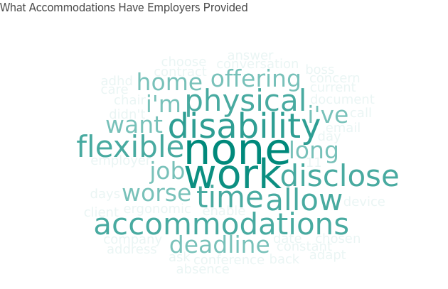 - Company size did not seem to matter in terms of meeting accommodations since when asked, 45% said their accommodations were not met to begin with.