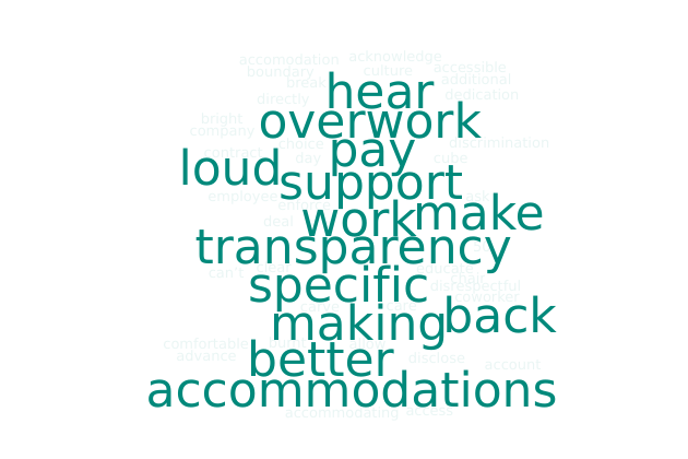 When it came to asking people what intersectional identities made it harder for them to get accommodations, gender and age were the biggest factors. This is not surprising since the industry in entry to mid-levels is mostly female, yet the highest concentration of men is in C level positions within publishing (Beckert and Jiménez 2020). And as previously mentioned, women are often ignored when it comes to medical issues. This can also correlate with age.