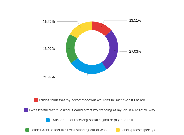 - A third of employees have left their employers due to a failure to accommodate their disabilities during their employment. 57% passed on a job outright, at least twice, due to a lack of accommodations. 28% passed upwards of five jobs. This may be expected of people in the early stages of their career, but in this sample size 69% of the participants would be considered mid-career (3-10 years).